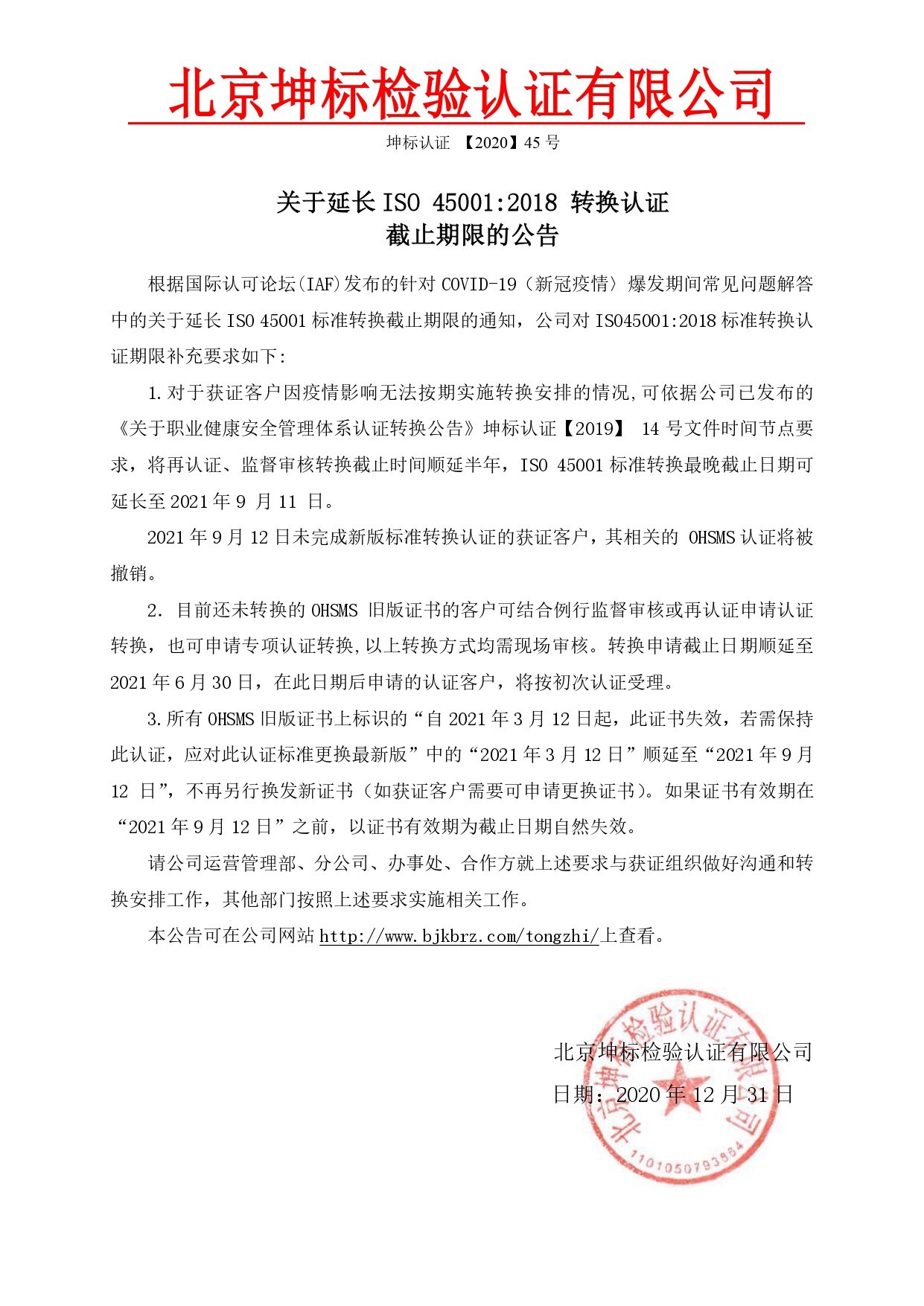 關(guān)于延長(zhǎng) ISO 45001:2018 轉(zhuǎn)換認(rèn)證 截止期限的公告